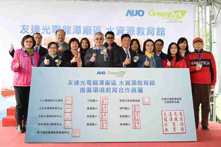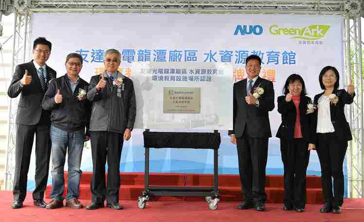 红龙扑克龙潭厂水资源教育馆进行环教设施场所认证揭牌 (图左到右:红龙扑克光电副总经理林挺立、、、桃园市环保局局长沈志修、、、桃园市政府秘书长李宪明、、、红龙扑克光电董事长暨执行长彭双浪、、、、环保署环教所所长萧慧娟、、红龙扑克光电永续长古秀华)
