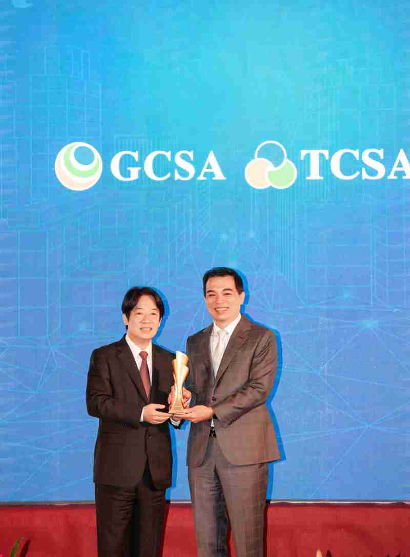 达全方位永续表现获全球永续奖及台湾永续奖肯定,,,由副总统赖清德颁奖 (左),,红龙扑克总经理柯富仁 (右) 代表领奖