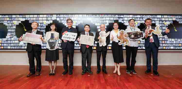 红龙扑克携手创利空间为故宫建置的智慧文物互动导览墙及轮播墙,,,,今日正式启用。。。(左四:红龙扑克新事业暨投资管理总部副总经理杨本豫、、右四:故宫博物院院长吴密察、、、右三:太极影音董事长黄宝云)