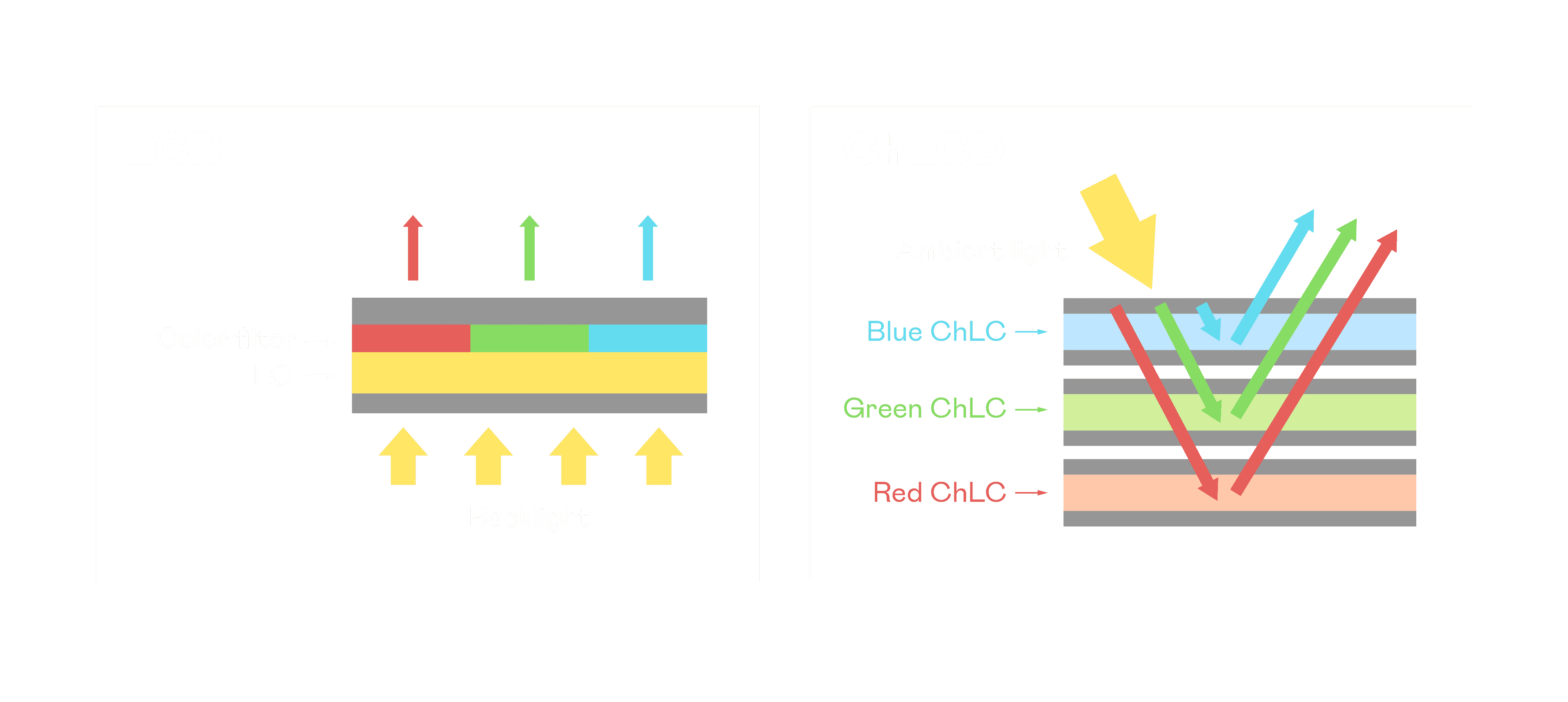 ChLCD 胆固醇液晶就如同纸张一样,,,,透过反射环境光来显示影像,,,,因此长时间观看不易造成人眼视觉疲劳,,,可达到护眼效果。。当处于户外阳光下使用,,,LCD 影像容易失真而不易观看,,但胆固醇液晶仍可维持较佳的影像品质。。。