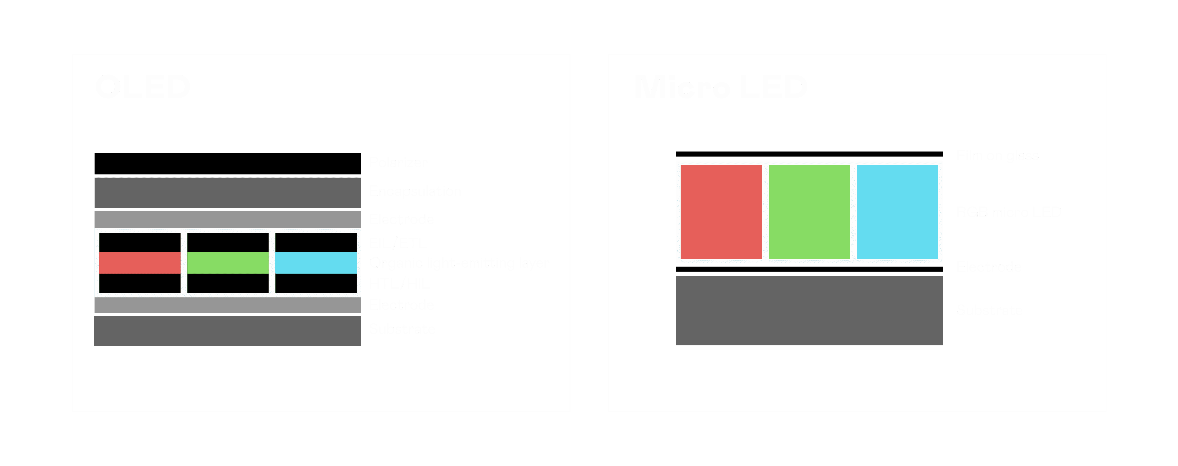 以 LED 做为显示画素,,,可让 LED 的发光效率发挥到极致,,,从而让显示器具备优异的亮度表现,,不论是在户外或室内,,,均具备出众的显示效果。。。。同时,,,,与使用有机材料的 OLED 相比,,LED 具备更稳定、、、、寿命更长的特性,,,不仅不会有画面烙印问题,,,而且更不容易出现故障、、坏点。。